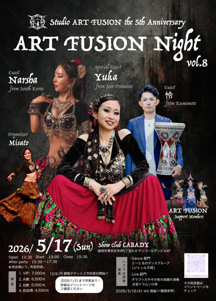 スタジオ5周年イベント開催決定‼️ •2025.11.01 CATEGORY : NEWS アメリカ、韓国よりスペシャルゲストをお招きし豪華ベリーダンスショーを開催します。チケット予約好評受付中。 イベント詳細はこちら